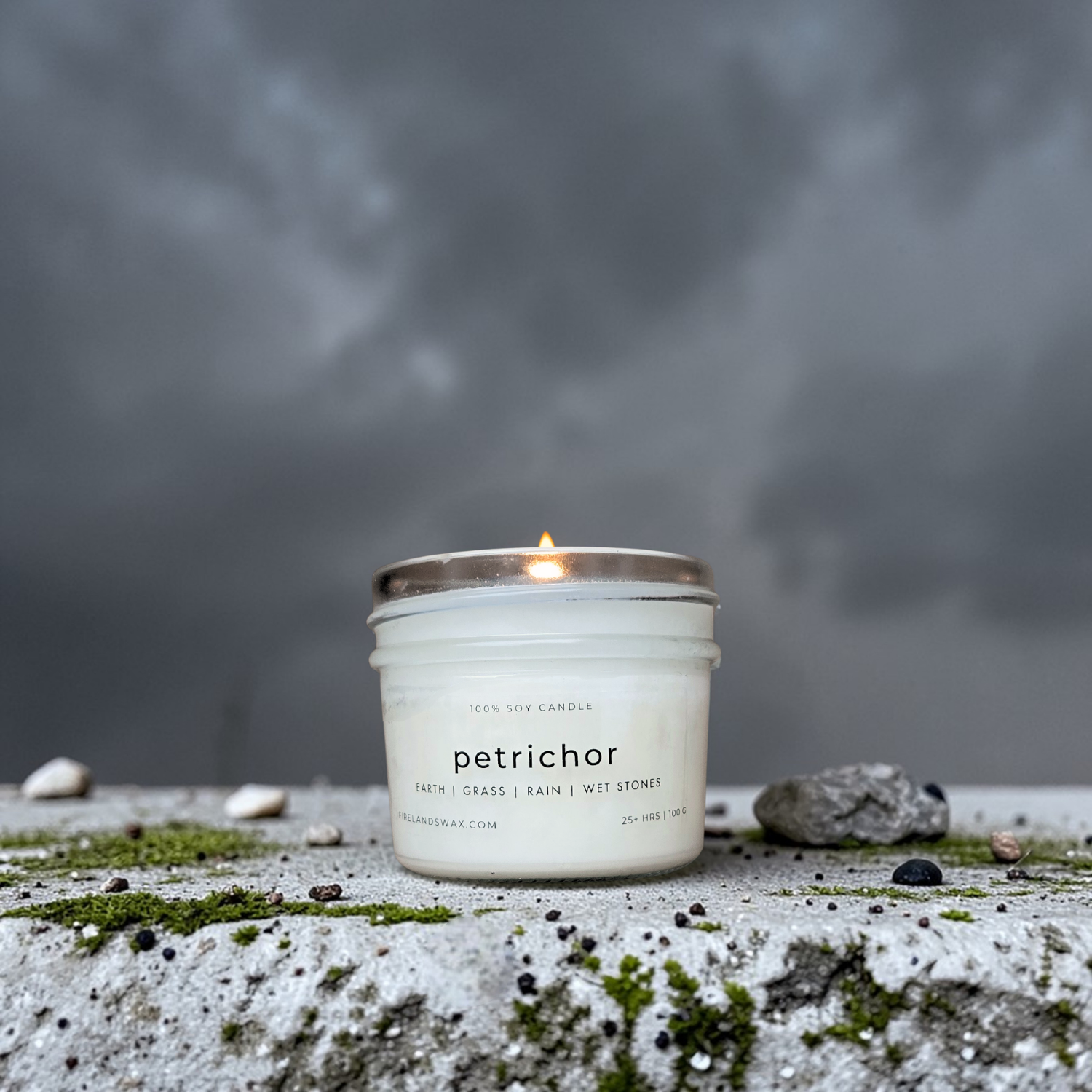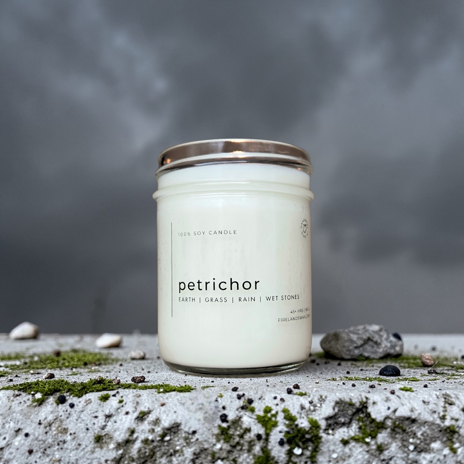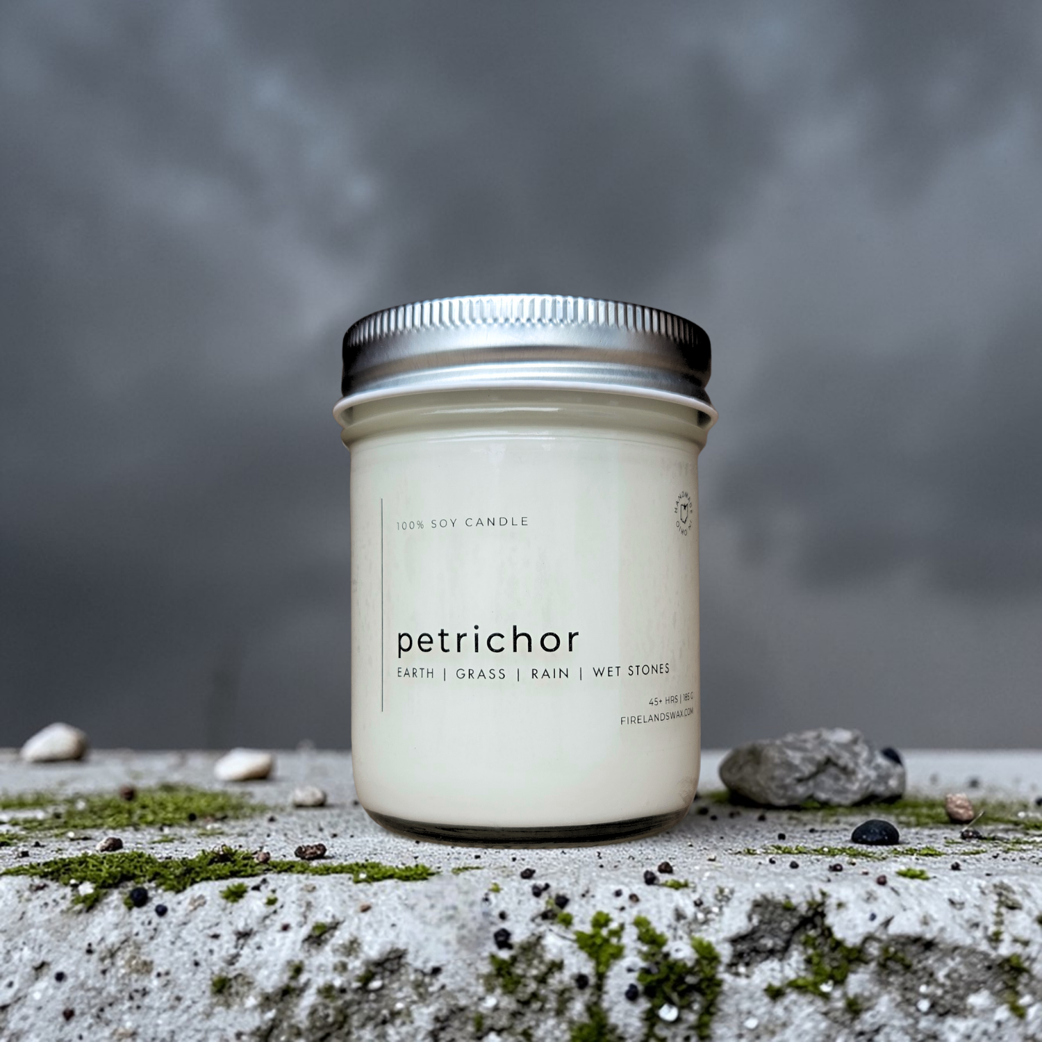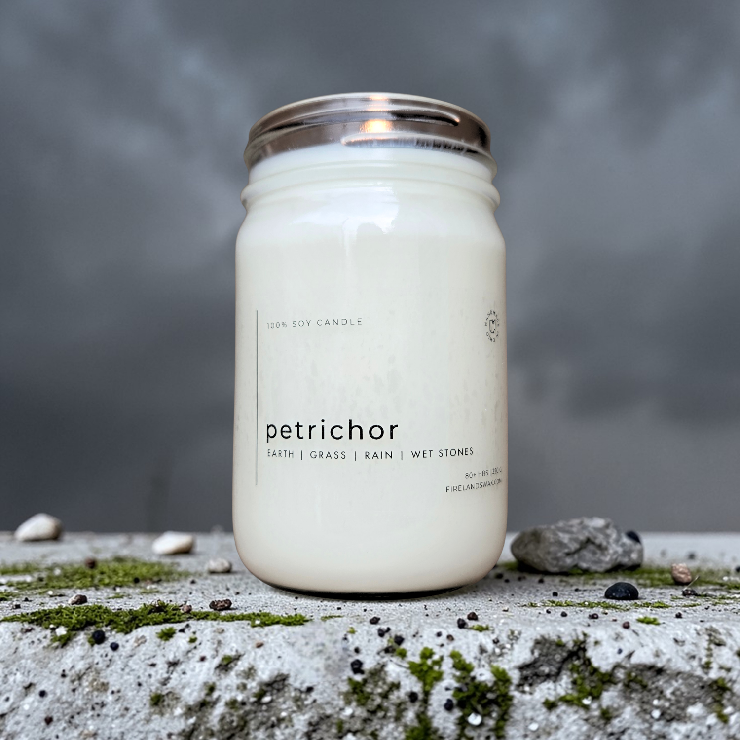 The most universally recognized scent of all the candles I make, Petrichor recreates the unmistakable aroma of rain-soaked earth in the quiet moments just after a storm. The scent comes from geosmin – a compound released by healthy soil bacteria and detectable by humans at just 10 parts per trillion. Our sensitivity to it is believed to be an evolutionary adaptation for finding water and assessing soil health, making the aroma a shared and welcome experience across cultures and continents. Blending notes of damp grass, wet stones, and fresh rainfall, this candle captures the ephemeral essence of early spring rains, not just in Ohio but everywhere, and the universal moment of stillness that follows.